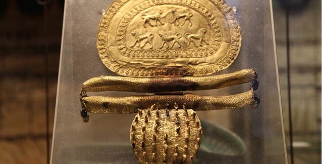 В 1876 г. при раскопках в Микенах на Крите Генрих Шлиман нашел несколько золотых погребальных масок. Самой восхитительной их этих драгоценных находок, несомненно, была та, которую теперь называют маской Агамемнона, датируемая примерно 1500 г. до н.э. Полное достоинства лицо, закрытые глаза, изящные борода и усы дают основание полагать, что это важная персона, возможно, местный правитель.